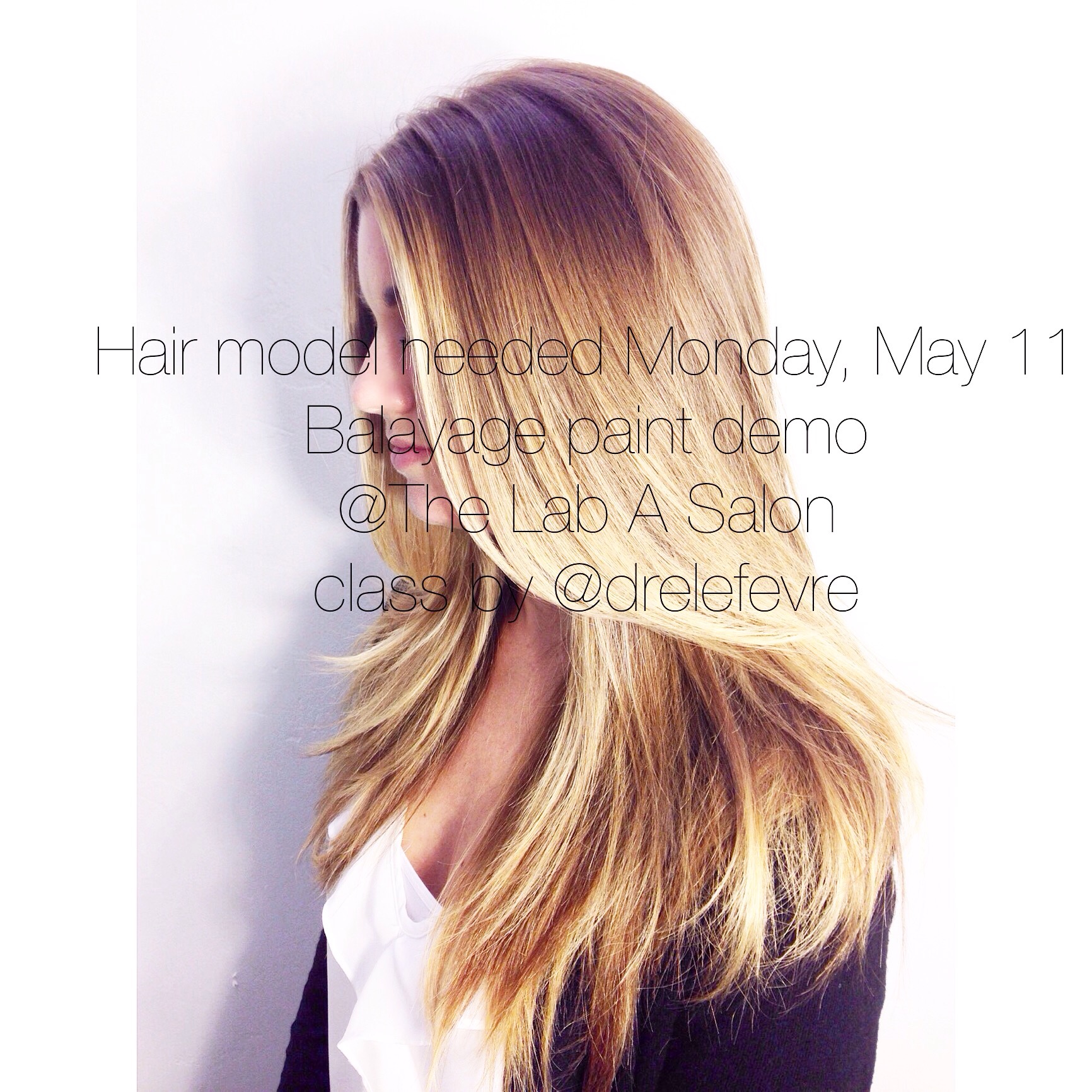 HAIR MODEL NEED! Monday, May 11 2015. Call time 10:30 am. End time 2:30pm. Compensation is balayage and hair cut by me:) I am looking for a model with little to no previous hair color. No dark artificial colors please! Old highlights are ok. My ideal model is: light brown- med brown naturally, bob length or longer, Medium thickness. Wavy is ok, not curly. If this sounds like you and you want a new look, please email me current photos of you and your hair. andrea4hair@yahoo.com #modelcall #hairclasssd #hairmodelsd #hairclass #balayageclass #balayageclasssd #thelabasalon @thelabasalon #sdsalon #bestsalonsd #bestsalon #haireducation #sandiegostylist #sandiegocolorist #sdbalayage #balayagehighlights #haircomp #freehaircolor #sandiegobeauty #hairsd #salonsd #sdsalon #stylistsd #sdstylist