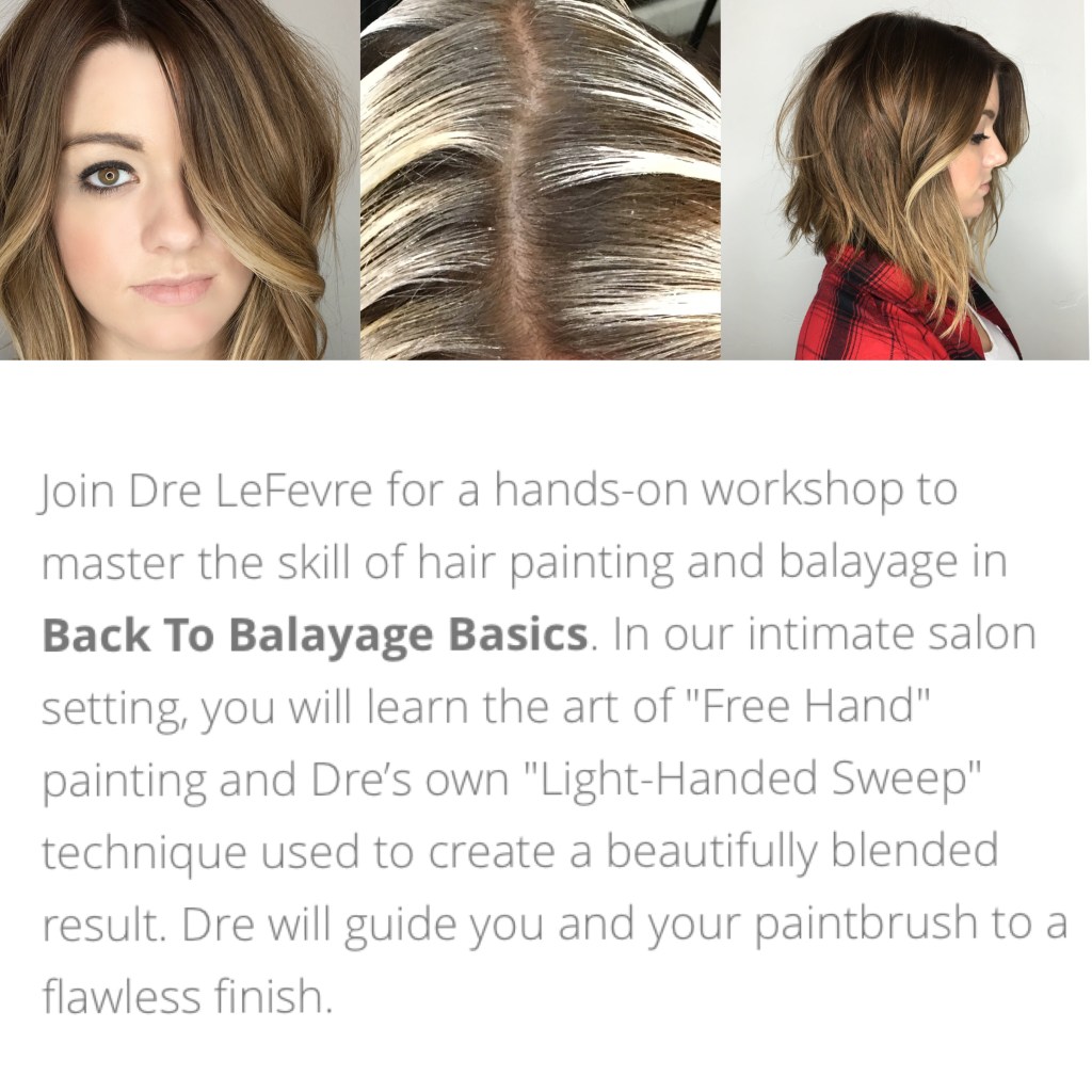 Join Dre LeFevre for a hands-on workshop to master the skill of hair painting and balayage in Back To Balayage Basics. In our intimate salon setting, you will learn the art of “Free Hand” painting and Dre’s own “Light-Handed Sweep” technique used to create a beautifully blended result. Dre will guide you and your paintbrush to a flawless finish.